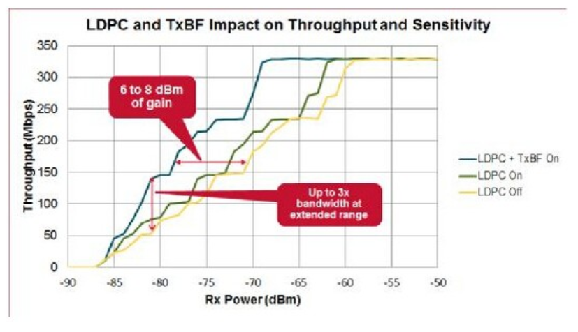 图2.LDPC和波束成形技术相互配合,能大幅提高接收器的吞吐能力和灵敏度。