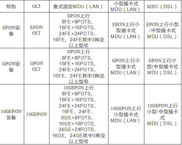 投标产品应是成熟稳定的产品,必须具备下表所列的设备型号,除10GEPON设备以外,其他设备需提供相应型号的电信设备进网许可证: