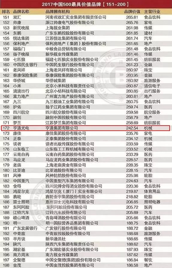 近日,2017年“第十四届世界品牌大会暨中国500最具价值品牌发布会“在北京隆重召开,由全球五大品牌价值评估机构之一的“世界品牌实验室”(World BrandLab)发布的2017年“中国500最具价值品牌”榜单也在会上正式揭晓。亨通集团拥有的“亨通光电”品牌蝉联该榜单,并以242.54亿元的品牌价值位列品牌榜第172名,实现了品牌价值的连年攀升。