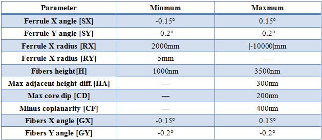 光迅科技推出的32芯MPO光纤连接器产品端面几何尺寸全部经过干涉仪测试,端面几何尺寸符合IEC 61755-3-31-2015相关参数要求,光学端面符合IEC 61300-3-35-2015相关技术要求。端面几何尺寸相关参数控制如表2: