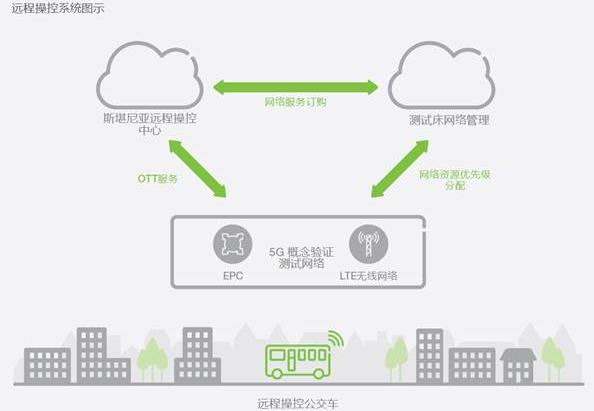 测试期间,一名远程驾驶员驾驶公交车在测试轨道上行驶并往返于停车场之间。公交车中的传感器数据(包括高清视频流)将借助LTE无线接入技术,通过5G演进核心网传输到遥控中心。测试台具有自动服务订购和开通功能,允许设置或取消网络资源优先分配给远程监视与操控系统。