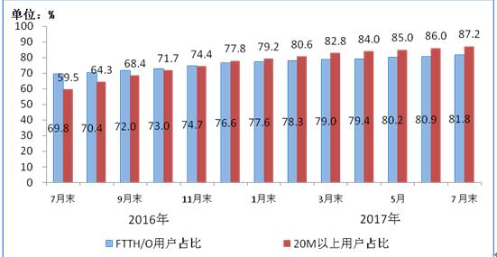 图4 2016-2017年7月光纤接入(FTTH/O)和20Mbps及以上固定宽带接入用户占比情况