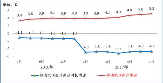 移动电话通话量持续下降。1-7月,全国移动电话去话通话时长完成1.57万亿分钟,同比下降4.7%;全国固定本地电话通话时长完成913亿分钟,同比下降18.5%,较上半年降幅收窄0.1个百分点。