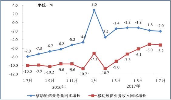 图7 2016-2017年7月移动短信业务量和收入同比增长情况