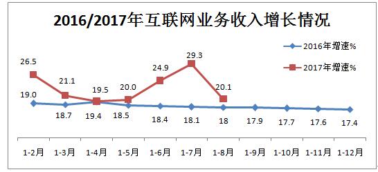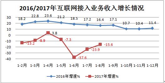 1-8月,互联网企业完成互联网接入业务收入121亿元,同比下降15.6%,降幅连续两个月收窄。