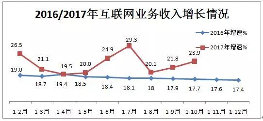 1~10月,互联网企业完成互联网接入业务收入158.3亿元,同比下降34.8%,降幅较1~9月扩大11.2个百分点。