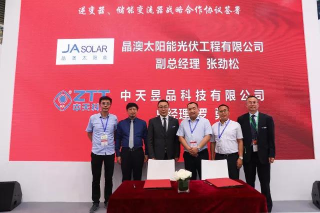 2018SNEC展会第一天,中天昱品科技有限公司(以下简称“中天昱品”)分别与晶澳太阳能光伏工程有限公司(以下简称“晶澳太阳能”)、东旭蓝天新能源股份有限公司(以下简称“东旭蓝天”)在中天新能源展台签署了逆变器、储能变流器的合作协议。