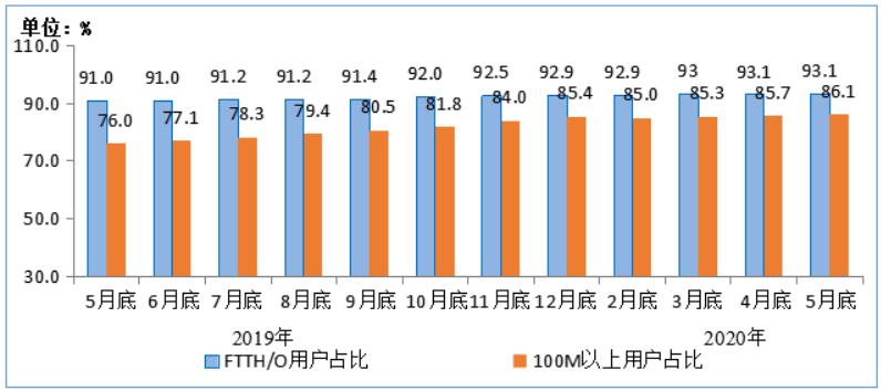 细分情况方面,固定宽带接入用户规模稳步增长,百兆接入用户占比继续提升。截至5月末,三家基础电信企业的固定互联网宽带接入用户总数达4.62亿户,同比增长7%,比上年末净增1253万户。其中,光纤接入(FTTH/O)用户4.3亿户,占固定互联网宽带接入用户总数的93.1%。100Mbps及以上接入速率的固定互联网宽带接入用户达3.97亿户,占总用户数的86.1%,占比较4月末提高0.4个百分点;1000Mbps及以上接入速率的固定互联网宽带接入用户达226万户,比上年末净增139万户。