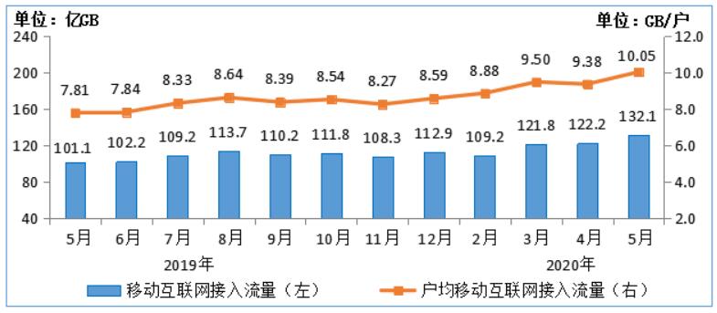 移动互联网流量保持较快增长,5月DOU值超10GB/户。1-5月,移动互联网累计流量达611亿GB,同比增长35.2%;其中,通过手机上网的流量达到590亿GB,同比增长31.1%,占移动互联网总流量的96.6%。5月当月户均移动互联网接入流量(DOU)达到10.05GB/户,同比增长28.8%,高于上年12月1.46GB/户。