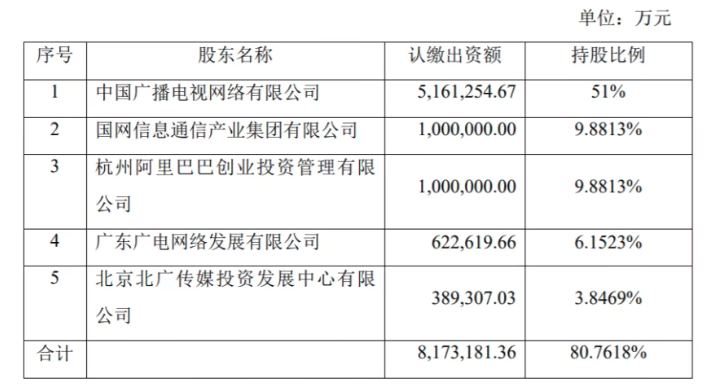 公告中透露了中国广电网络股份有限公司的前五大股东信息,分别为:中国广播电视网络有限公司、国网信息通信产业集团有限公司、杭州阿里巴巴创业投资管理有限公司、广东广电网络发展有限公司、北京北广传媒投资发展中心有限公司。其中,中国广播电视网络有限公司出资5,161,254.67 万元,占据51%的份额,为主要持股人。