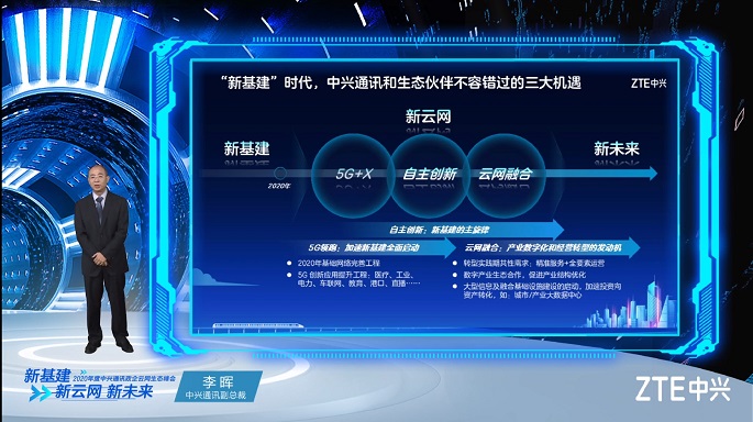 中兴通讯副总裁李晖在《新基建、新云网、新未来》的主题演讲中全面诠释了在新基建时代,5G+X、自主创新、云网融合,是中兴通讯必须把握住的三大机遇。他将2020年云网生态升级的要点总结为“1+X+3”——“1”是指云网基石、“X”是指各类能力中台、“3”是指云网生态的3大保障体系,并表示此架构将助力中兴通讯与合作伙伴在新基建的主航道上领跑先行,开拓新未来。