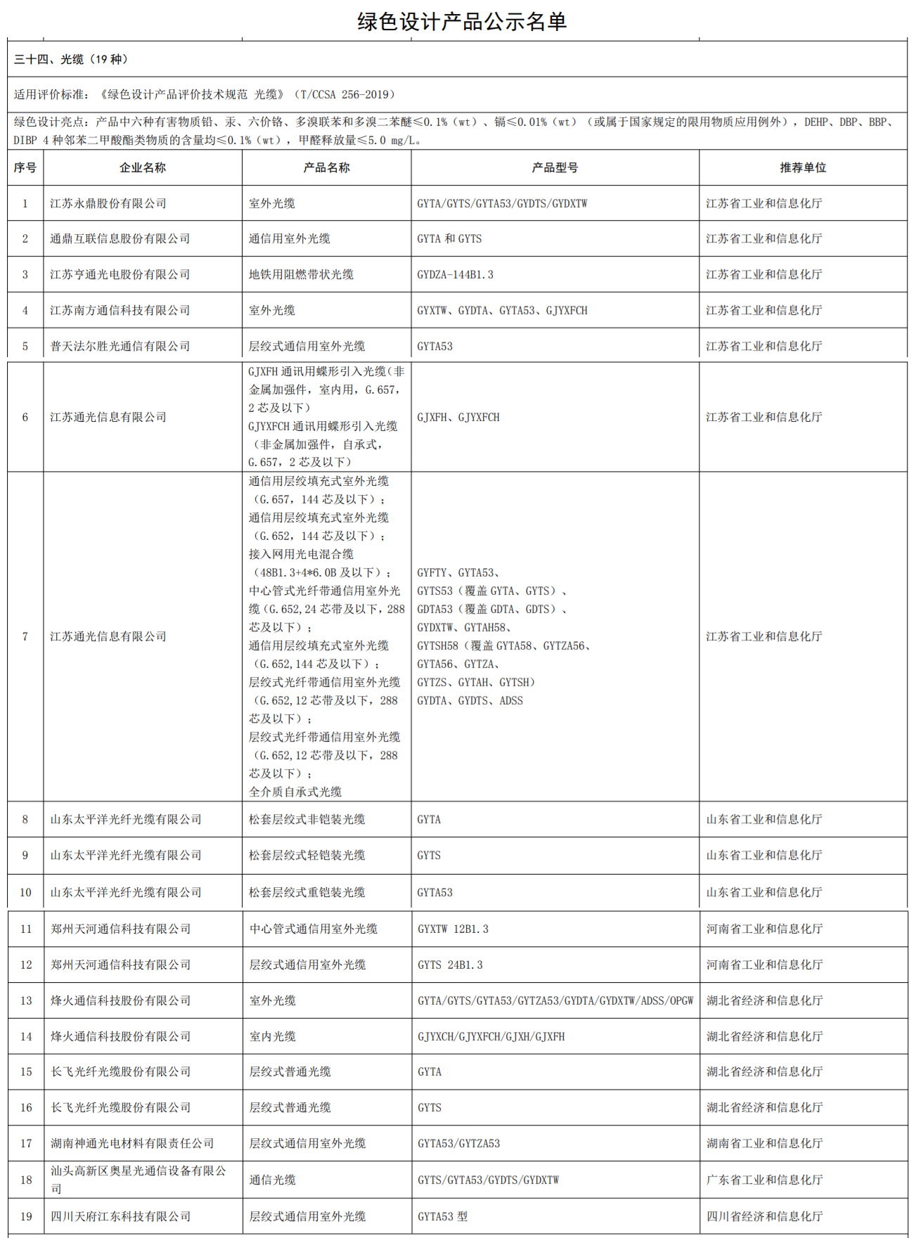 入选企业的“光缆”产品适用评价标准是《绿色设计产品评价技术规范 光缆》(T/CCSA 256-2019)。绿色设计亮点包括:产品中六种有害物质铅、汞、六价铬、多溴联苯和多溴二苯醚≤0.1%(wt)、镉≤0.01%(wt)(或属于国家规定的限用物质应用例外),DEHP、DBP、BBP、DIBP 4 种邻苯二甲酸酯类物质的含量均≤0.1%(wt),甲醛释放量≤5.0 mg/L。