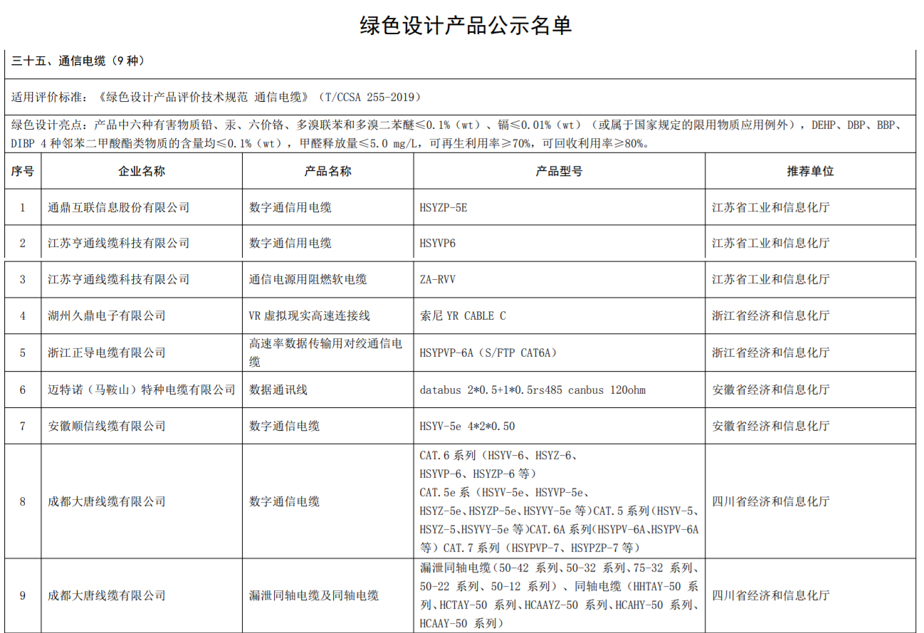 入选企业的“通信电缆”产品适用评价标准是《绿色设计产品评价技术规范 通信电缆》(T/CCSA 255-2019)。绿色设计亮点包括:产品中六种有害物质铅、汞、六价铬、多溴联苯和多溴二苯醚≤0.1%(wt)、镉≤0.01%(wt)(或属于国家规定的限用物质应用例外),DEHP、DBP、BBP、DIBP 4 种邻苯二甲酸酯类物质的含量均≤0.1%(wt),甲醛释放量≤5.0 mg/L,可再生利用率≥70%,可回收利用率≥80%。