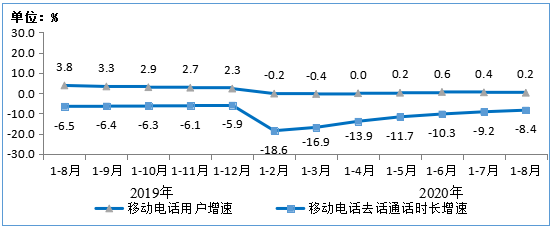 图8 2019年-2020年1-8月移动电话用户增速和通话时长增速