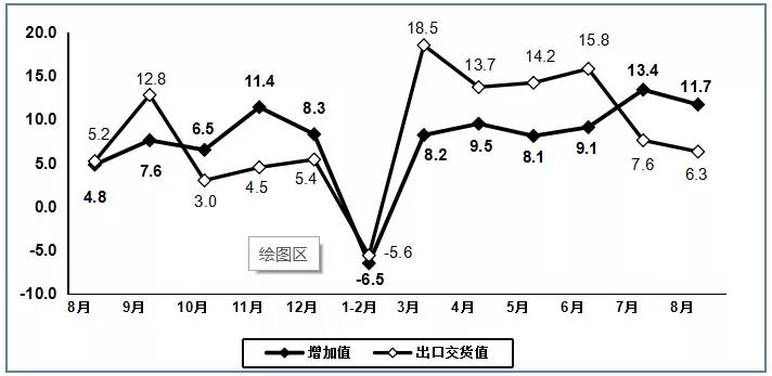 图1 2020年8月电子信息制造业增加值和出口交货值分月增速(%)