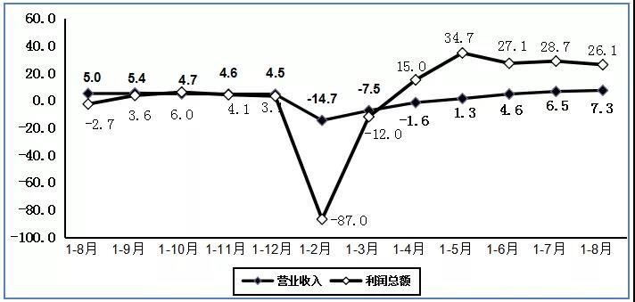 图2 2020年1-8月电子信息制造业营业收入、利润增速变动情况(%)