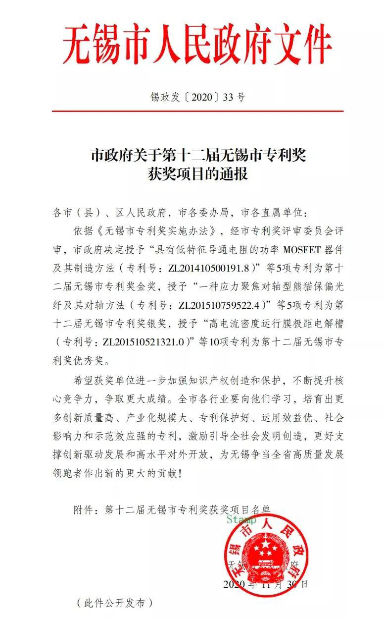 近日,无锡市政府发布《关于第十二届无锡市专利奖获奖项目的通报》。