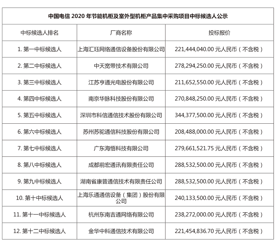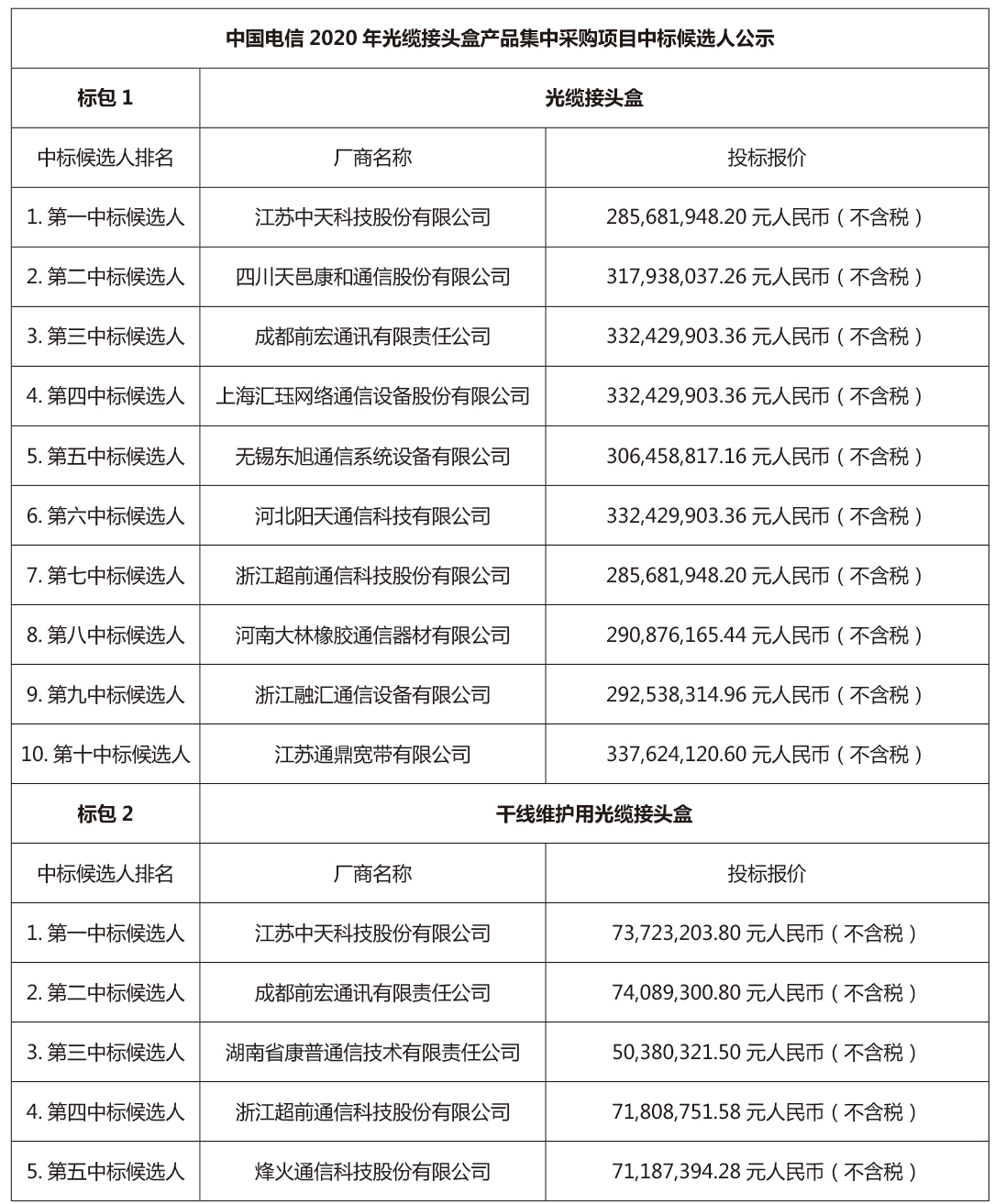2020/12/28 责任编辑:swift 12月25日,中国电信2020年光缆接头盒产品集中采购项目中标候选人公示:通鼎宽带、中天科技、烽火通信等多家厂商上榜。具体名单及投标报价等情况见下表:此外,中国电信当天还公示了2020年节能机柜及室外型机柜产品集中采购项目中标候选人,亨通光电、中天宽带等12家厂商入选。具体名单及投标报价等情况见下表:中国电信采购招标