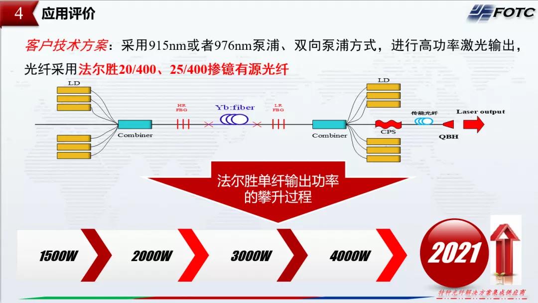 报告中,赵霞总经理表示,面对中高功率光纤激光器市场的快速增长,高功率光纤激光器的应用是未来市场发展的必然趋势,核心器件的国产化应用也是企业发展的巨大机遇。光纤激光器的前沿技术要求光纤在光纤尺寸、数值孔径、光纤组分及光纤结构方面做出新的突破和迭代,法尔胜通过近三年的不懈探索和努力,自主研发的20/400和25/400掺镱有源光纤凭借产品优良的一致性和稳定性,成功推向市场,实现产业化,研发过程中,公司不断追求并实现单纤1500W到4000W以上功率水平的提升。