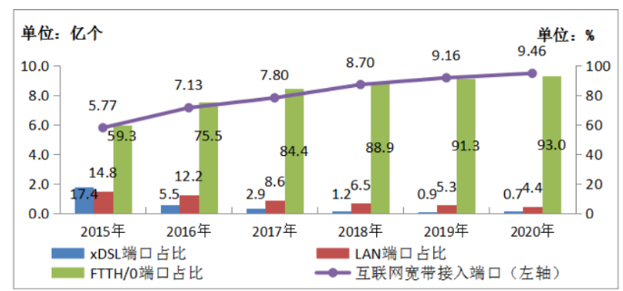 加快5G网络建设,不断消除网络覆盖盲点,提升网络质量,增强网络供给和服务能力,新一代信息通信网络建设不断取得新进展。2020年,新建光缆线路长度428万公里,全国光缆线路总长度已达5169万公里。截至2020年底,互联网宽带接入端口数量达到9.46亿个,比上年末净增3027万个。其中,光纤接入(FTTH/0)端口达到8.8亿个,比上年末净增4361万个,占互联网接入端口的比重由上年末的91.3%提升至93%。xDSL端口数降至649万个,占比降至0.7%。