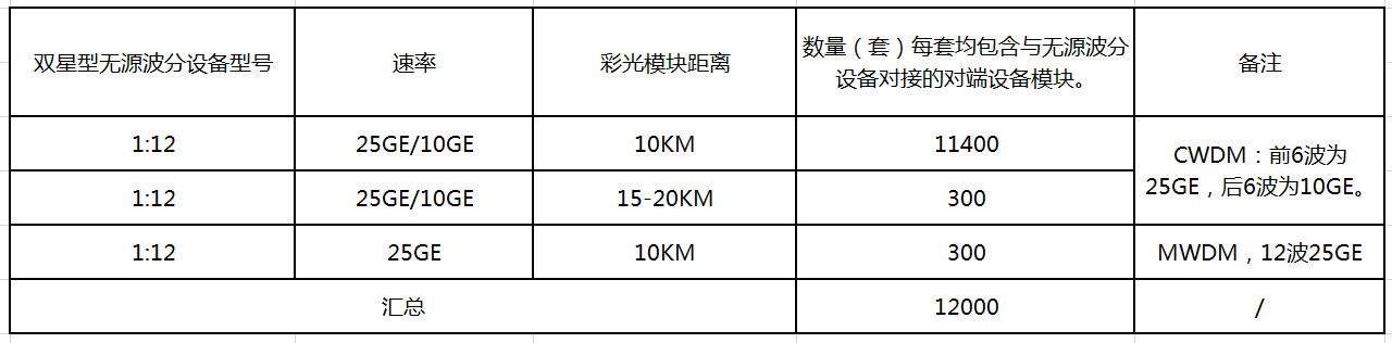 本项目拟采购1:12双星型无源波分设备产品及其配件,具体如下表: