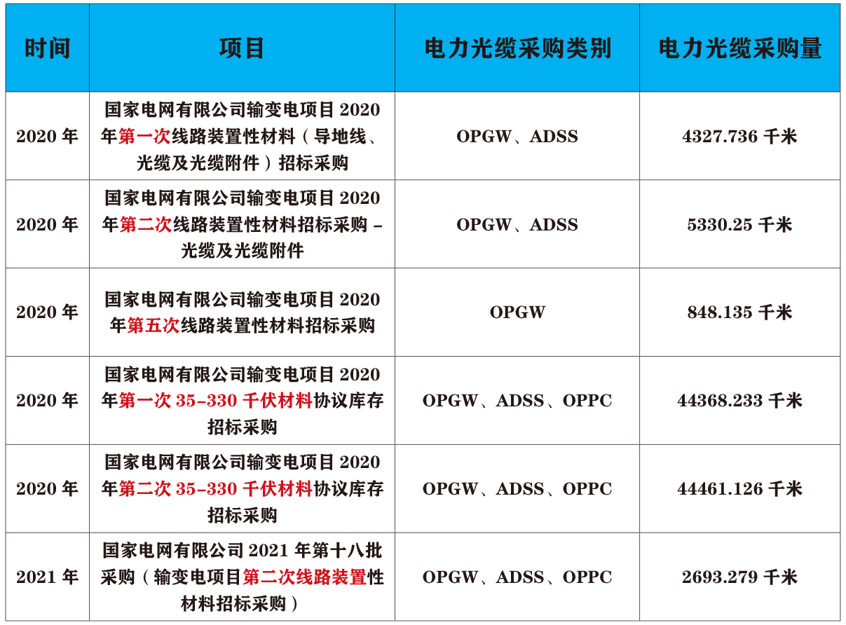 从2020年全年以及2021年至今的国家电网光缆采购项目表来看,主要采购的电力光缆有OPGW、ADSS、OPPC光缆,显示出国家电网在电网建设过程中,对电力光缆产生一定的需求量,也给光电线缆行业增添发展潜力。