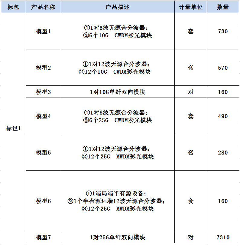 公告显示,本项目拟采购6波无源合分波器、CWDM彩光模块、MWDM彩光模块等产品,具体采购量见下表: