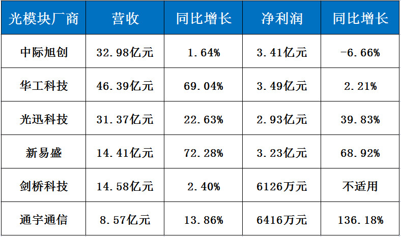 上表不难看出,主要光模块企业业绩总体趋势向好,营收实现不同程度的增长,净利方面,大多数光模块企业业绩表现强劲。数据显示,部分光模块厂商的高速光模块以及点对点光模块的毛利率可达29.62%至33.10%,此外,部分光模块厂商,如华工科技的光通信板块收入同比增幅91.56%。