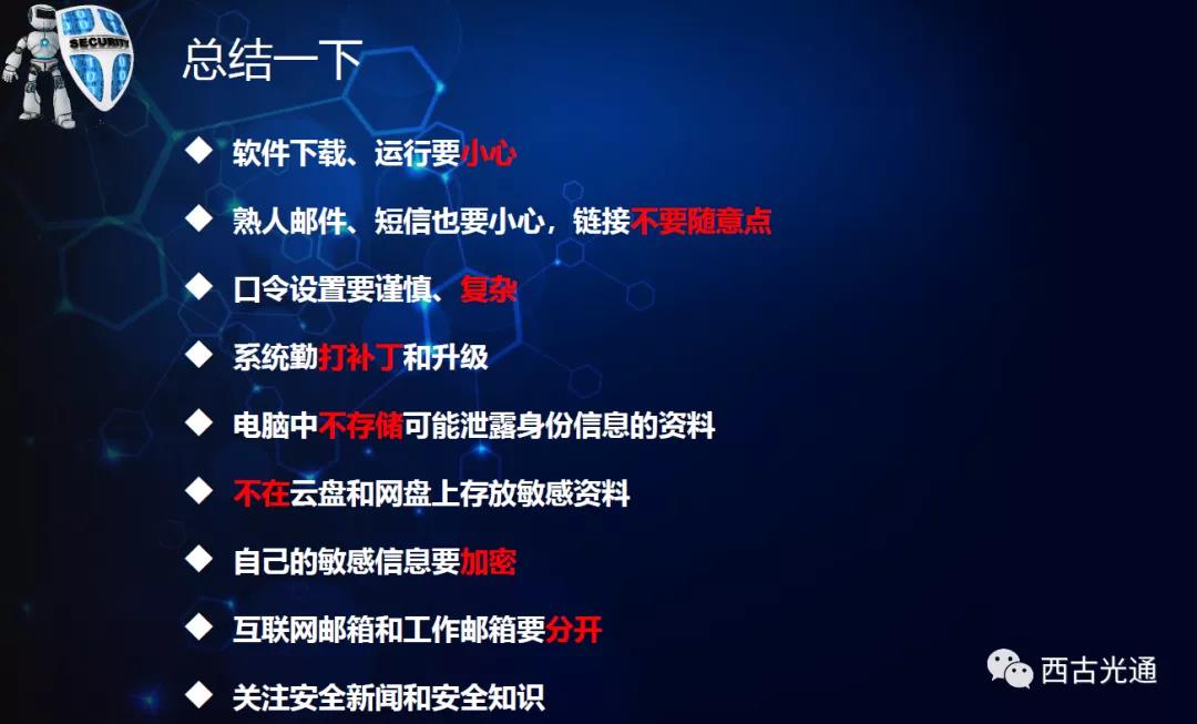此次培训从信息安全现状、基本概念、常见攻击手段、常见错误、日常安全行为准则、重要信息保密、安全建议和案例分析等方面,对如何提升信息安全意识作了讲授。针对日常工作中由于信息安全意识淡薄造成的数据泄露和安全隐患,建议各位员工在使用个人电脑、电子邮件和移动设备时需要严格管理个人密码,及时更新漏洞补丁、查杀病毒、不点击来源不明的附件。