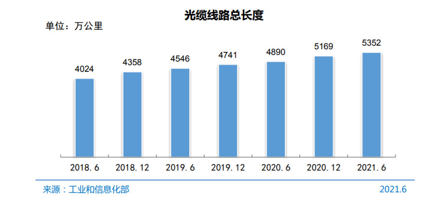 光缆线路方面,截至2021年6月,全国光缆线路总长度达到5352万公里,较2020年12月净增183万公里。其中接入网光缆、本地网中继光缆和长途光缆线路所占比重分别为63.5%、34.4%和2.1%;接入网光缆较2020年12月净增193万公里,占比同比提高2个百分点,推动光纤网络进一步优化升级。