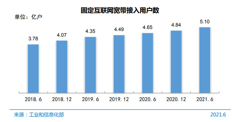 固定宽带接入情况方面,截至2021年6月,三家基础电信企业的固定互联网宽带接入用户总数达5.1亿户,较2020年12月净增2606万户。其中,100Mbps及以上接入速率的固定互联网宽带接入用户达4.66亿户,占总用户数的91.5%,较2020年12月提高1.6个百分点;1000Mbps及以上接入速率的固定互联网宽带接入用户达1423万户,较2020年12月增加122.3%,占2021年固定互联网宽带新接入用户的30.1%。