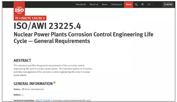 2021年11月23日,经国际标准化组织(ISO)技术管理局(TMB)批准,苏州热工研究院有限公司(简称“中广核苏州院”)主导申报的国际标准ISO AWI/23225.4《Nuclear Power Plants Corrosion Control Engineering Life Cycle — General Requirements 》(《核电站腐蚀控制工程全生命周期 通用要求》)正式立项。该标准是中国广核集团(简称“中广核”)在核电领域首个主导申报并成功立项的国际标准。同时,中广核苏州院孙永亮成为该标准制定项目组中国代表团提名专家,并担任项目组负责人(Project Leader)。