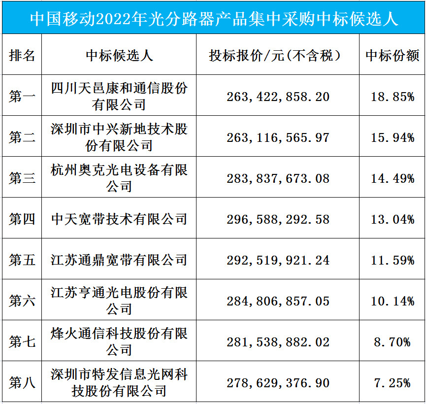 2021/12/15 责任编辑:swift 12月14日,中国移动2022年光分路器产品集中采购中标候选人公示。中标候选人的投标报价及中标情况如下表:据悉,本项目拟采购约1,307.10万个光分路器产品,设置最高投标限价为31391.29万元(不含税总价)。上表不难看出,8家厂商的投标均价约2.8亿元(不含税)。中国移动采购招标