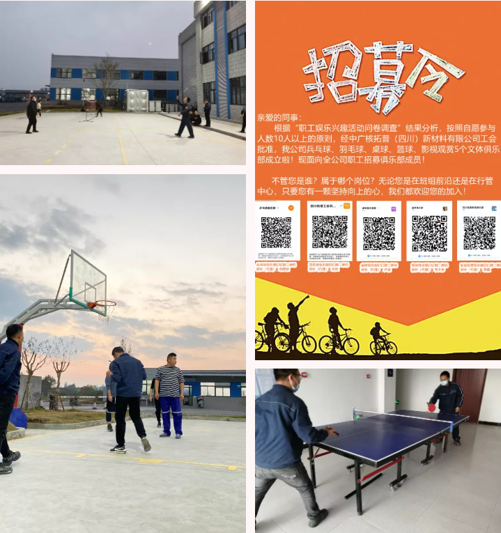 丰富员工业余生活,营造良好企业文化氛围。开展民意调查,充分吸取员工意见和建议,成立了兵乓球、羽毛球、篮球、桌球、影视观赏5个文体俱乐部,各俱乐部形成各自章程,定期开展活动,不断吸收成员,均已初具规模。