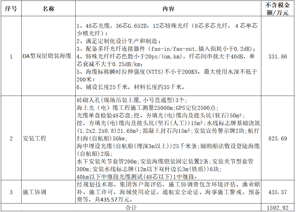 2022/03/04 责任编辑:swift 3月2日,中国移动广东公司2022年桂山岛至外伶仃岛海底光缆建设公开招标项目(珠海)公告发布,采购内容包括DA型双层铠装海缆等,如下表:项目不划分标段。设置最高投标限价:不含税总价限价1,592.92万元。中国移动采购招标