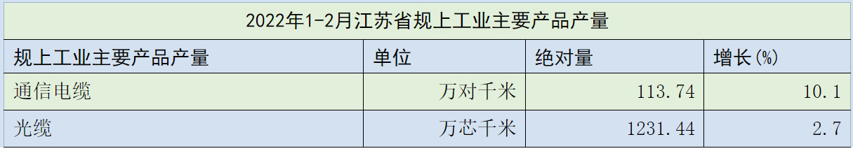 2022/03/30 责任编辑:swift 近日,江苏省公布2022年1-2月规上工业主要产品产量数据。数据显示,1-2月,江苏省通信电缆产量绝对量113.74万对千米,增长10.1%;光缆产量绝对量1231.44万芯千米,增长2.7%。光纤光缆