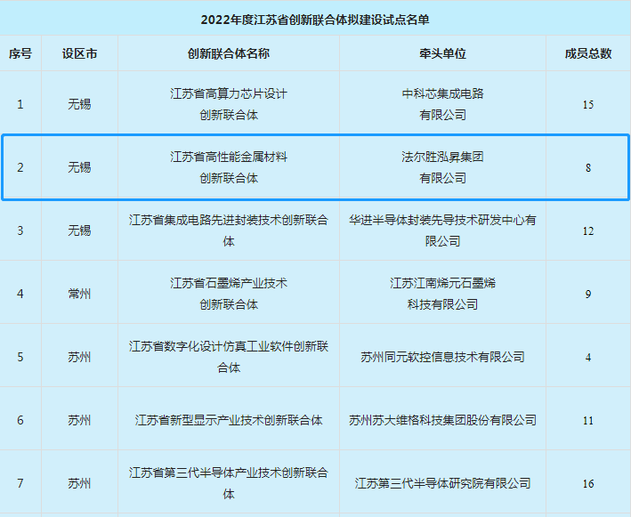 近日,江苏省科技厅对2022年度拟建设试点的10家创新联合体进行公示,法尔胜泓昇集团牵头的江苏省高性能金属材料创新联合体入围名单!