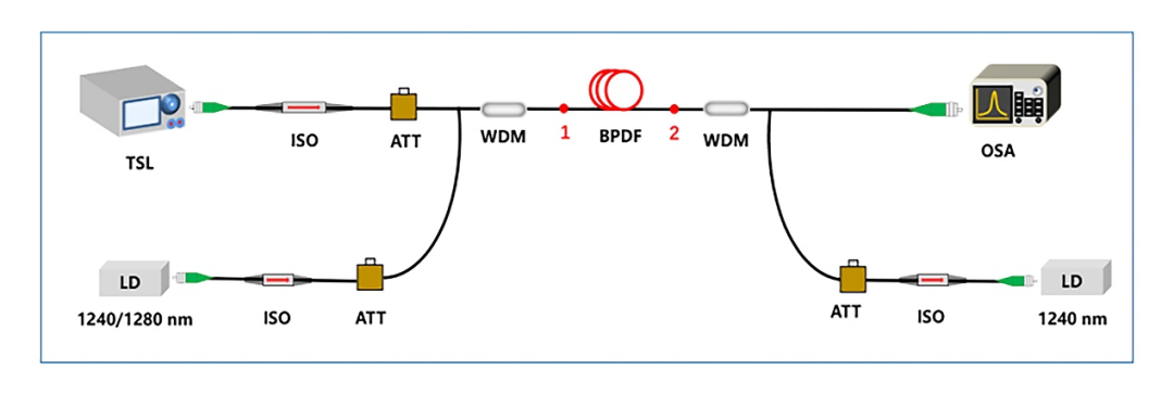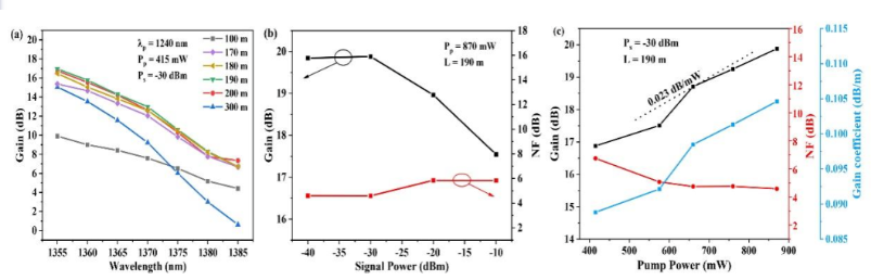 研究团队采用改进的化学气相沉积技术结合液相掺杂工艺(MCVD)制备出低损耗Bi/P共掺石英基光纤,光纤的背景损耗低至17dB/km。团队基于该自制光纤搭建了光纤放大器,系统地比较了不同泵浦方式和泵浦波长下放大器的增益性能以及光纤长度,泵浦功率,信号功率与增益的关系。采用双向泵浦方式,泵浦波长为1240nm,总泵浦功率为870mW,信号功率为-30dBm,190m长掺铋光纤在1355nm处获得的最高增益接近20dB,最小NF为4.6dB。这是国内首次利用自制的低损耗掺铋光纤实现净增益。该类光纤的成功研制有望加快推进我国掺铋光纤放大器及激光器的自主研制,满足宽带放大器对掺铋宽带增益光纤材料国产化的迫切需求。