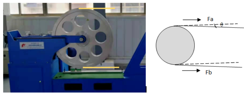 光缆拉伸试验中的换向导轮即图1中的传递装置,是一个可以自由转动的定滑轮,如图2所示。从理论上来说,如果非刚体的光缆自重不能忽略,则无论施加多大的拉力,光缆的重力都需要一个向上的力来平衡,即光缆不可能被拉到完全水平的状态,只能无限接近水平,也即真实的光缆与水平线总会保持一定的角度θ。只有拉力很大,光缆自重比较小的情况下,θ角会趋近于零。光缆在拉伸过程中保持静止状态时,卡盘处于动平衡状态,可以近似认为换向导轮两侧的光缆拉力Fa和Fb相等。缠绕在滑轮上的光缆受力近似处处相等,都等于光缆受到拉力。意味着换向导轮上的半圆弧光缆长度可以完整计入光缆受试长度。