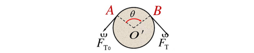 卡盘是用来固定光缆的,通常光缆在卡盘上缠绕4到5圈再在尾端通过加持固定,就能让光缆在拉伸端承受较大的拉力而不会发生滑动。实操经验可知夹持端受力很小,只要稍加固定就能保持光缆固定。这里有个典型的拴牛的案例,其力学原理一样。放牛时为了不让牛随意破坏庄稼,会把牛拴在一个树桩上,让其在固定的区域吃草。这个时候为了防止牛挣脱缰绳,会把缰绳在树上缠绕几圈后再打结固定,这个时候牛就很难挣脱了。其理论分析如下,简化的受力模型如图4所示。