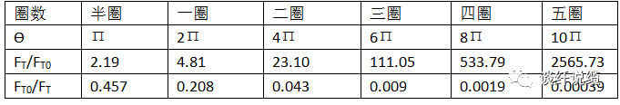 μ0为绳子与卡盘之间的静摩擦系数。光缆是一个非均匀的组合体,受到拉伸时,其中各个组件受力大小不一致。其中加强材料受力最大,占65%。当光缆缠绕在卡盘上时,中间金属加强芯被塑管包围构成缆芯缠绕在卡盘上。此时这个μ0应该由各个组件共同作用构成。对于典型的GYTS光缆一般采用磷化钢丝作为加强抗拉材料,磷化钢丝和PPT之间摩擦系数在0.2左右,外护套和卡盘之间摩擦系数在0.4左右。综合各组件的抗拉贡献率,可设定μ0为0.25。则得到如表1的数据,即光缆绕半圈、一圈、一直到第五圈的拉力分布情况: