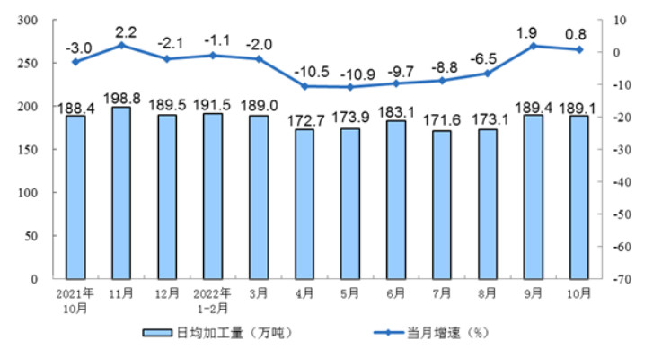 原油加工增速放缓。10月份,加工原油5862万吨,同比增长0.8%,增速比上月放缓1.1个百分点,日均加工189.1万吨。1—10月份,加工原油55588万吨,同比下降4.5%。