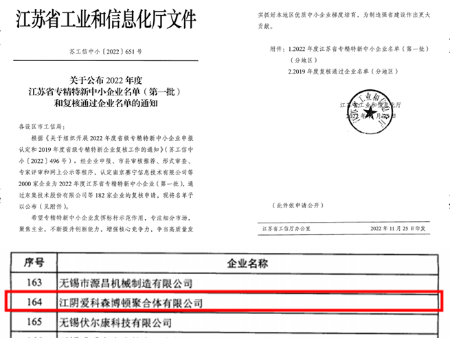 通过“江苏省2022年度专精特新中小企业”认定,参编T/SHPTA 010-2021《充电桩电缆用聚氯乙烯弹性体料》团体标准,两项实用新型专利获得国家知识产权局授权,分别是“一种用于密炼机添加微量液体的装置”(专利号:ZL202123344324.1)和“一种挤出机的中段液体催化剂添加装置”(ZL202123122156.1)。