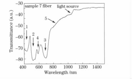 基于上述实验结果,适当减少样品1的氧气体积分数条件,制备了样品7预制棒。图4是样品7预制棒所拉制光纤的透射谱线。光纤存在1个明显的吸收峰1,2,3,4和1个弱吸收带5,分别位于460,520,600,680nm和800~900nm波段,其中吸收峰2和3可与图2中样品1预制棒切片的520和680nm吸收峰对应,弱吸收带5与样品1的750~850nm波段的弱吸收特征对应。