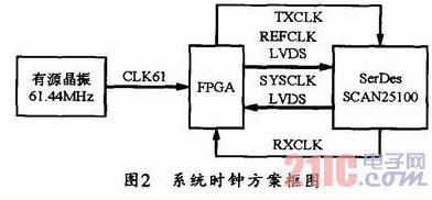 采用输出频率为61.44MHz的有源晶振为FPGA提供系统基准时钟(CLK61),系统所需的其他频率时钟,均可使用FPGA内置的时钟管理模块,对CLK61进行分频、倍频及移相而得。SCAN25100有四个时钟端口,与FPGA相连。系统时钟方案如图2所示。