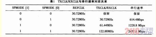 TXCLK为FPGA输出给SCAN25100,用于采集输出数据tx_data(9:0)的时钟。RXCLK为SCAN25100输出给FPGA,用于采集输入数据rx_data(9:0)的时钟。TXCLK和RXCLK配置使用INCMOS18电平,均为双边沿采集数据,其时钟频率由用户根据需求配置SCAN25100串行接口(DOUT和RIN)的传输速率决定。SPMODE(1:0)的配置值决定传输速率,对应关系见表1。