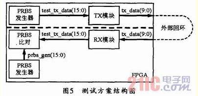 为了对系统的光纤通讯传输进行测试,在FPGA中定义了一个PRBS(伪随机码序列)模块,用于产生测试数据,数据帧头为0x50BC。例化两个相同的PRBS模块,一个放置于发送端,产生测试数据,通过发送模块,由FPGA输出。将一根光纤的两端同时连接于光模块形成自环回路,FPGA发送端输出的PRBS测试数据,经由FPGA外部回环返回给FPGA接收。当FPGA接收端接收到数据为0x50BC时,接收端放置的另一个相同PRBS模块开始启动(未接收到帧头0x50BC则一直处于等待状态),产生与发送端相同PRBS数据送入PRBS比对模块,与接收数据进行比对。PRBS比对模块输出比对结果,同时可使用Chipscope抓取接收数据与发送数据对比,确认系统是否正常工作。测试方案结构图见图5所示。