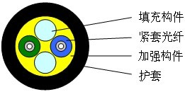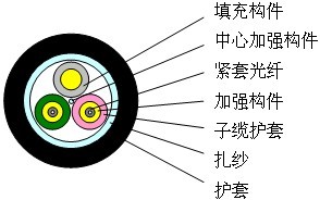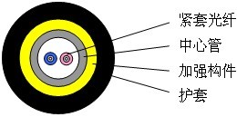 (2)由紧套光纤、加强构件,以及可能有的填充构件、扎纱、包带等组成,典型结构见图3~图6;