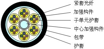 (3)由多个子单元以及可能有的非金属中心加强构件等组成,子单元由子单元护套、子缆或紧套光纤,以及可能有的加强构件组成,典型结构见图7~图8。