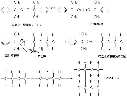 过氧化物交联聚乙烯是先用聚乙烯树脂配合适量的交联剂和抗氧剂,根据需要有时还加入填充剂的软化剂等组份,充分混合,制成可交联的聚乙烯混合物颗粒。然后用挤出机等设备将此混合物挤包在导体上,加工成型,再将包有可交联聚乙烯混合物的线芯,通过一个有一定压力和一定温度的交联管道设备,使聚乙烯中的交联剂引发,分解成化学活性很高的游离基,夺取聚乙烯分子中的氢原子,使聚乙烯主链的某些碳原子转变为活性游离基,二个大分子链上的游离基相互结合,即产生交联,交联好的聚乙烯绝缘线芯尚需经过冷却,再卷绕收线。以过氧化二异丙苯(DCP)为例,其与聚乙烯的交联反应如下: